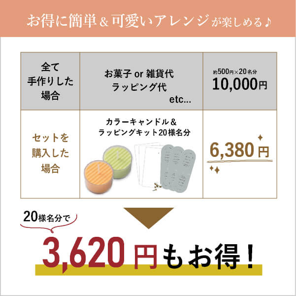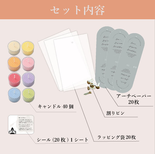 | 内容物 | ・アーチペーパー(ペーパーヘッダー)×20枚 ・割りピン×20個 ・ラッピング袋(PP袋)×20枚 ・キャンドル ×各20名様分(1名様あたり2個ずつ使用) ・注意喚起のシール×1シート(1名様あたり1個使用) |