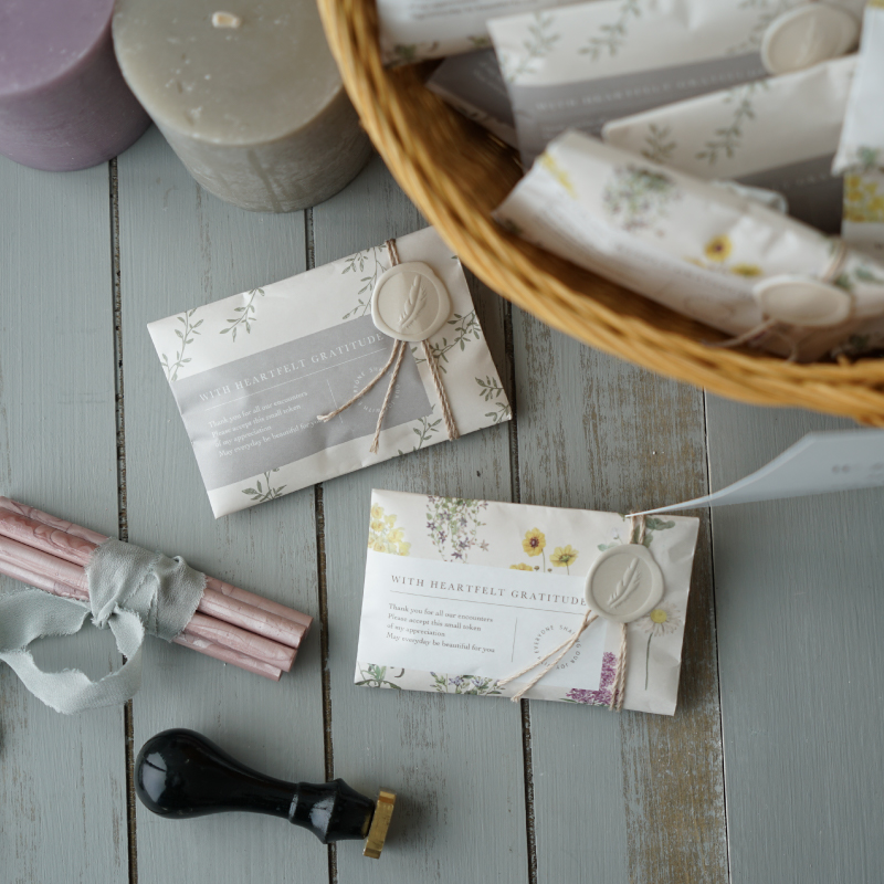 淡く優しい色合いと、繊細な草花の模様がおしゃれなラッピングキット。