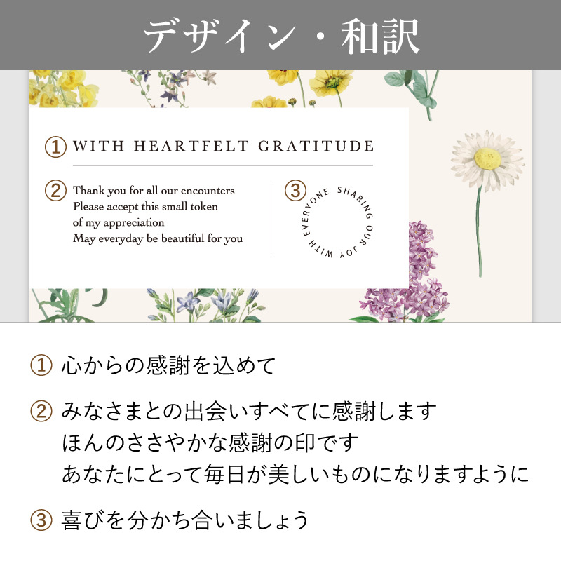 心の込もったメッセージが印字された素敵なカードを添えてより丁寧な印象に。裏面には手書きでメッセージも書けます♪