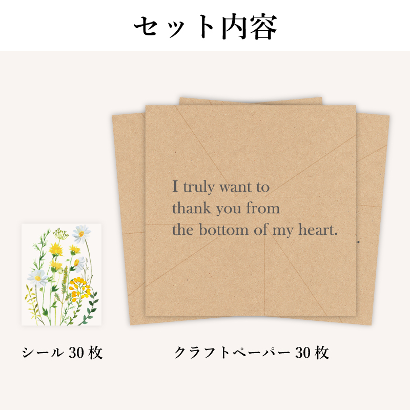 | 内容物 | ・クラフト紙×30枚 ・シール×30枚 |