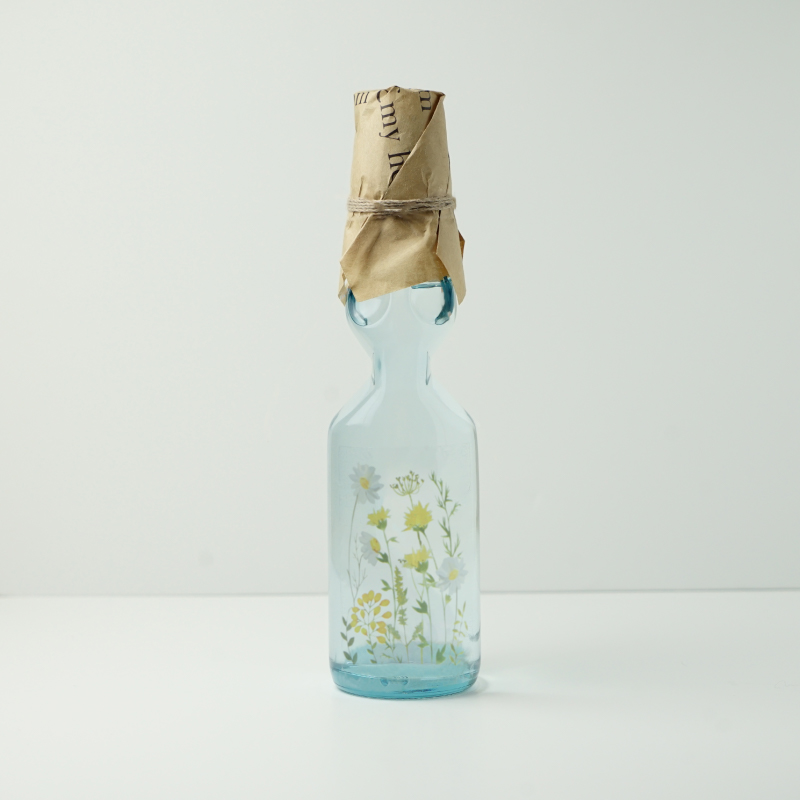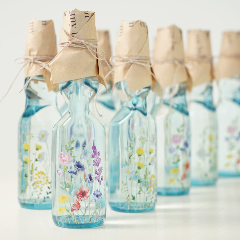 ラムネの瓶をラッピングして、透き通るビンの中に草花が浮かんでいるような、ハーバリウムを思わせる美しさが印象的なラッピングキット