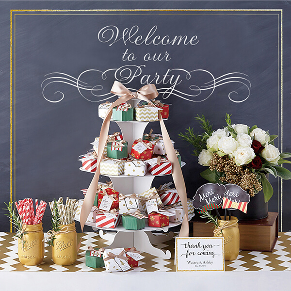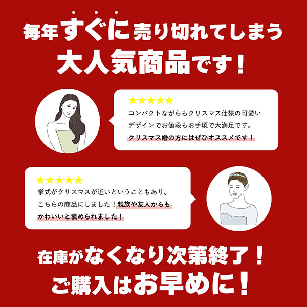 期間限定!レッド×グリーンにゴールドを配色した、ちょっと大人なクリスマス仕様の5種アソートプチギフト。クリスマスウェディング以外にもクリスマスパーティーにも喜んでいただけるアイテムです。