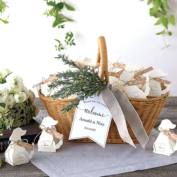 イヌ好きのおふたりにぴったりな、オシャレなtagを付けた可愛いプチギフト。ペットへの愛情と同じくらいたっぷりの感謝の気持ちを込めて…大切なゲストさまへ気持ちがしっかり伝わるプチギフトです。