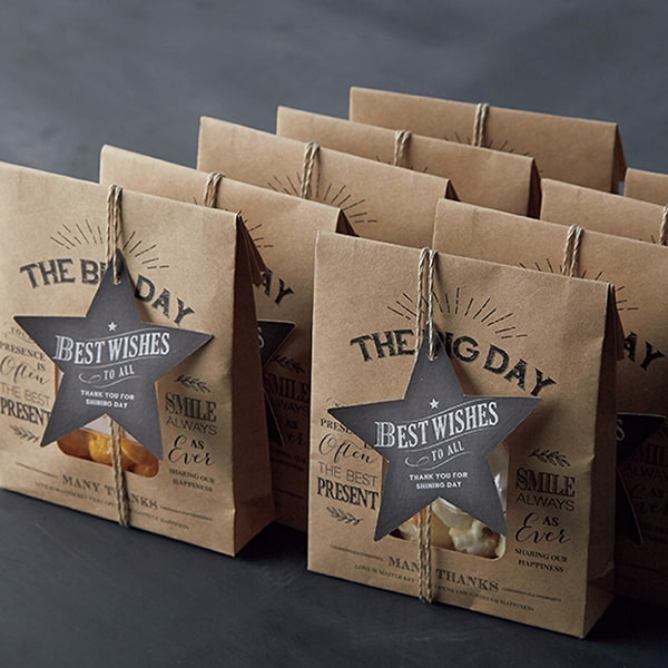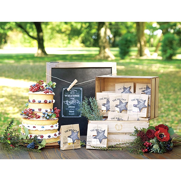 結婚式のテーマが映画風で、席次表などもクラフト紙を作っていたので、正しくテーマにぴったりでした!味も杏仁豆腐等バリエーションに富んでいて、自分で食べたいくらいです(笑) 無料のシールも素敵なデザインがたくさんあって絞り混むのが大変な位でした。