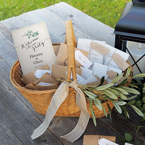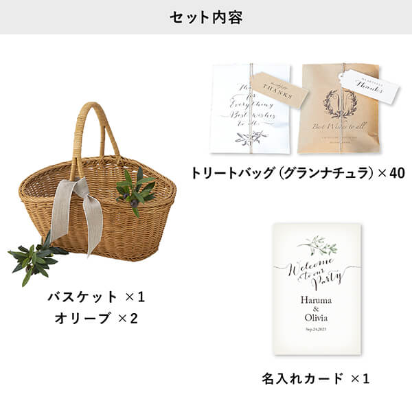 | 付属品 | バスケット 造花(オリーブ)×2 麻リボン 名入れカード(英字(頭文字のみ大文字)・挙式日) |