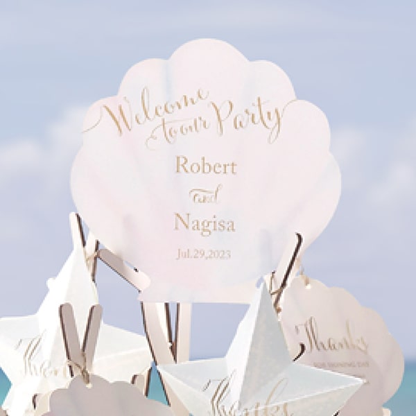 シェル型のおしゃれな名入れカードには新郎新婦さまのお名前と挙式日を印字!