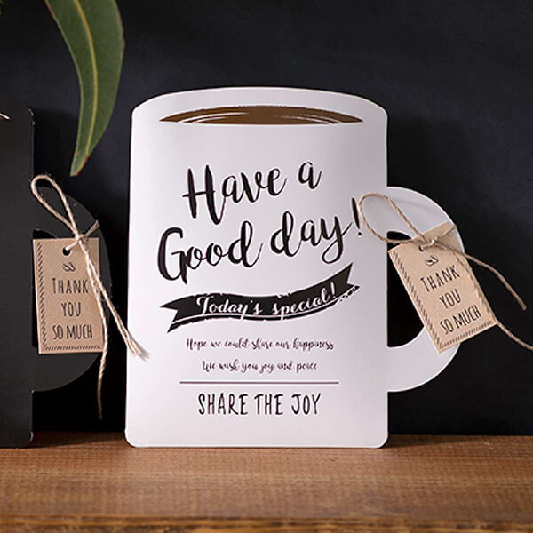 コーヒーカップ型のパッケージにクラフト紙とタグと麻ひもの組み合わせがマッチ。楽しかった時間を思い出しながら過ごす、上質な時間を過ごせていただけること間違いなし!甘いものが苦手な大人ゲスト様に喜んでいただけるプチギフトです。