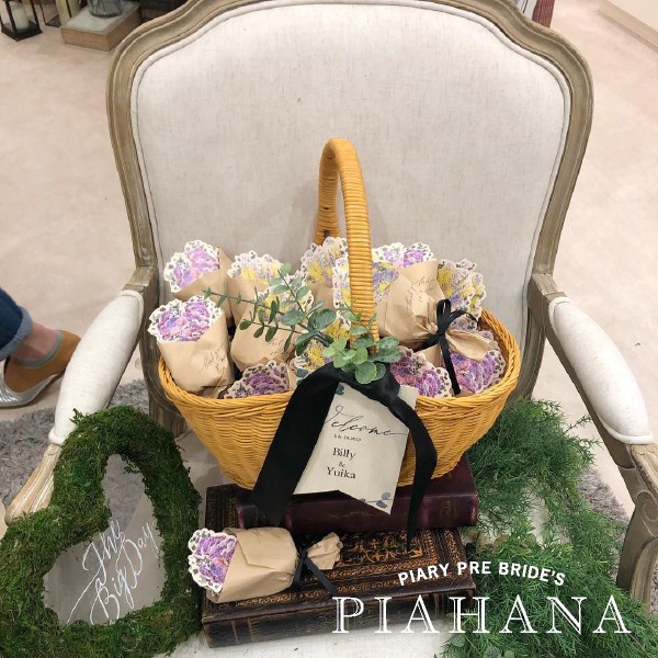 ミニ花束の包装なので、大量にカゴに入っていても、新郎新婦が手渡す時も、ゲストの手元に渡った時もどの瞬間も華やかで可愛いです。 中のお菓子の味は食べてないので分からないです。