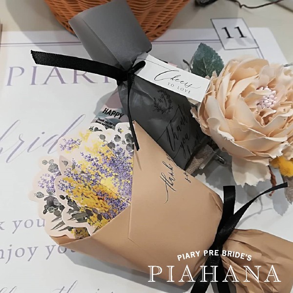 本物の花束のようにラッピングされたおしゃれなプチギフト。クラフトと黒いリボンが大人っぽさを演出してくれます。ナチュラルなテイストから上品なイメージまで、幅広い結婚式の雰囲気にご利用いただけます。