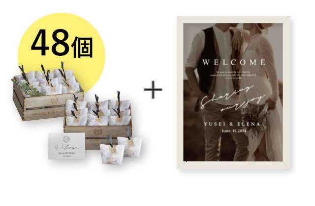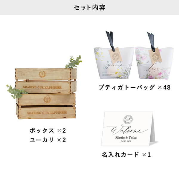 | 付属品 | ウッドBOX 2箱※組立て必要 造花(ユーカリ) 名入れカード(英字(頭文字のみ大文字)・挙式日) |