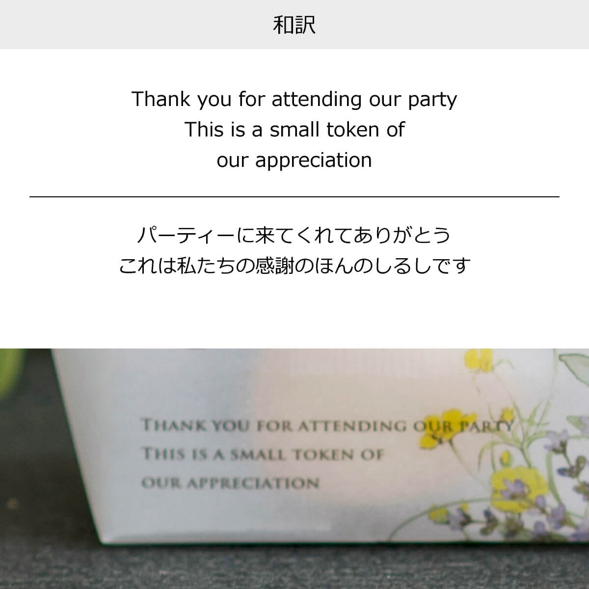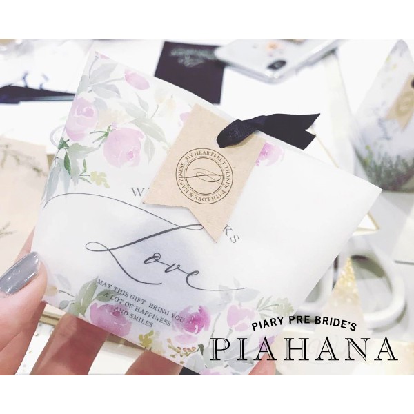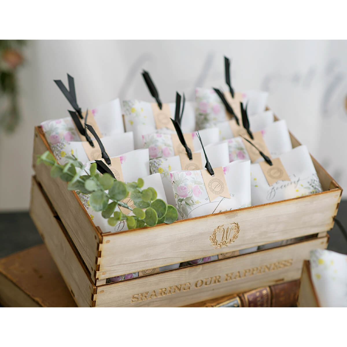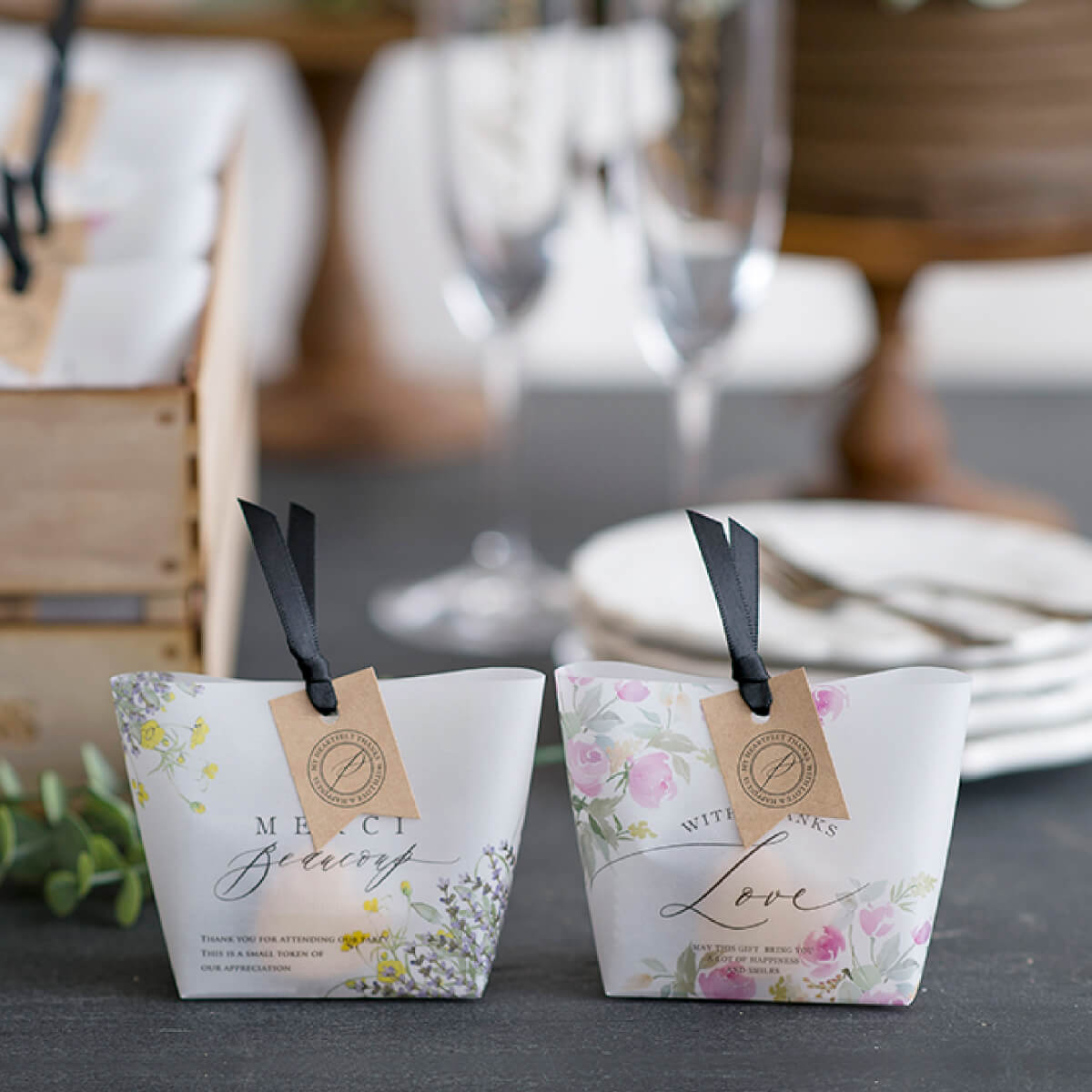 刻印のようなシンプルでおしゃれなデザインが施された、フラッグ型のタグ付き!トレーシングペーパーのパッケージには透け感があり、美しさ、華やかさ、上品さを詰め込んだ可愛いプチギフト。ナチュラルテイストな結婚式やガーデンウェディングにもぴったりです。