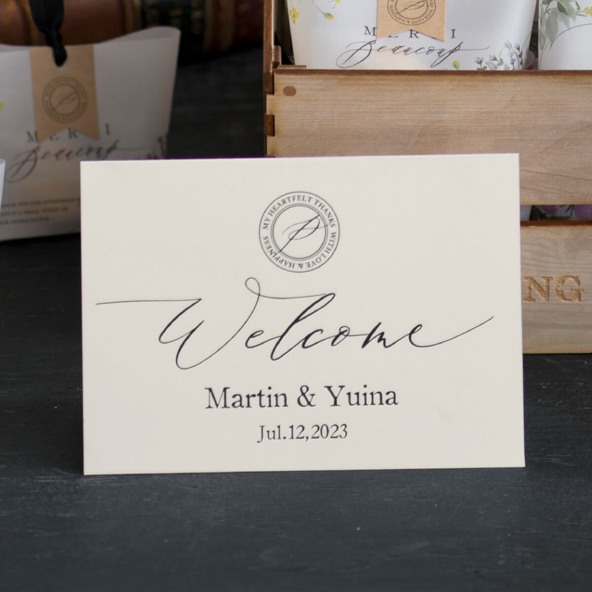 シンプルな名入れカードは、一緒に飾るとよりハイセンスなウェルカムスペースのアイテムとして演出できます。