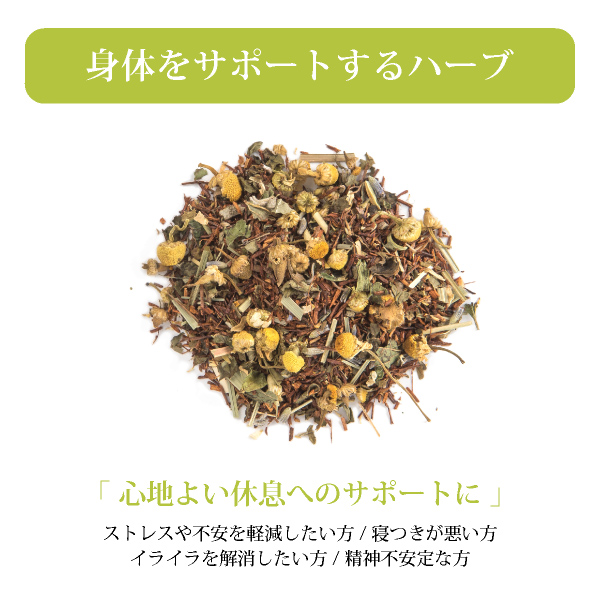 落ち着きをサポートすることで有名なカモミールとラベンダー中心に、ペパーミント、セージ、豊富な栄養素で体を温めるルイボスを絶妙な配合比で厳選したハーブでブレンド。