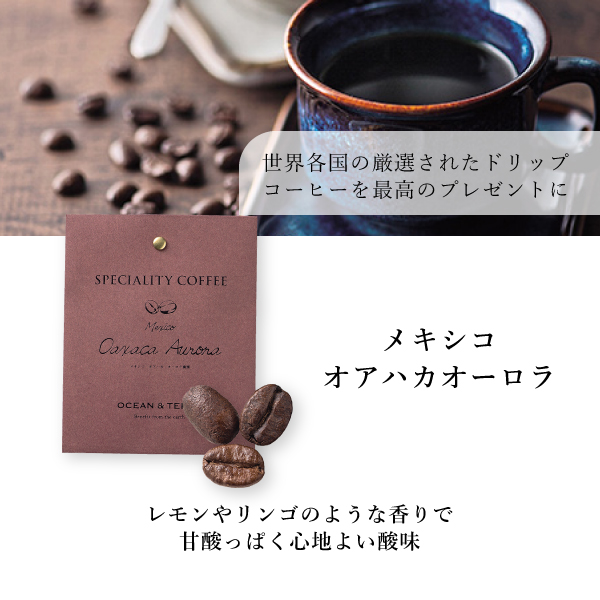 手軽に世界旅行気分を味わえる!希少価値のある高級なスペシャリティコーヒーが、ドリップコーヒーになったプチギフトです。コーヒー好きの方への贈り物にぴったり。レモンやりんごのような香りで甘酸っぱく心地よい酸味が特徴の「メキシコ オアハカオーロラ」をドリップバッグで気軽に楽しめます。シックでシンプルなデザインのスペシャリティコーヒー。大切な人にほっと暖かく、優雅なひとときをお届けします。