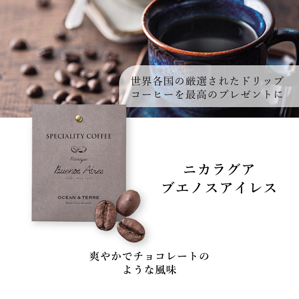 手軽に世界旅行気分を味わえる!希少価値のある高級なスペシャリティコーヒーが、ドリップコーヒーになったプチギフトです。コーヒー好きの方への贈り物にぴったり。爽やかで、チョコレートのような風味が特徴の「ニカラグア ブエノスアイレス」をドリップバッグで気軽に楽しめます。シックでシンプルなデザインのスペシャリティコーヒー。大切な人にほっと暖かく、優雅なひとときをお届けします。
