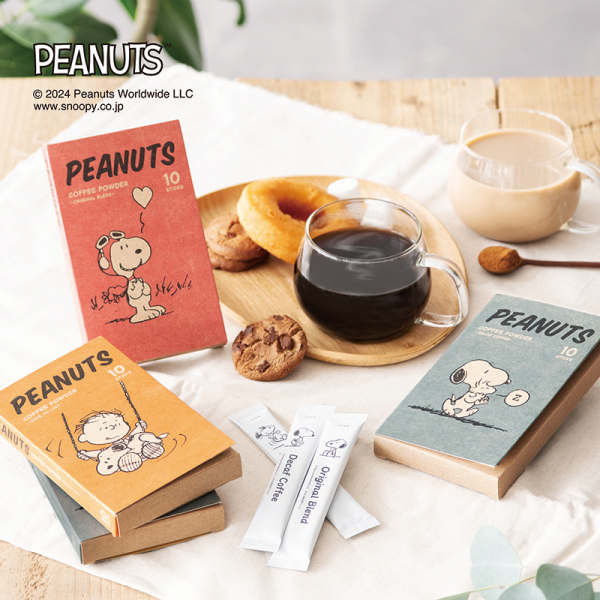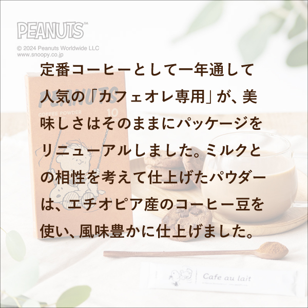 定番コーヒーとして一年通して人気の「カフェオレ専用」が、美味しさはそのままにパッケージをリニューアルしました。スヌーピーの大好物であるチョコチップクッキーとマッチするオリジナルのカフェオレ・ブレンド。コーヒー豆はエチオピア産を使用。