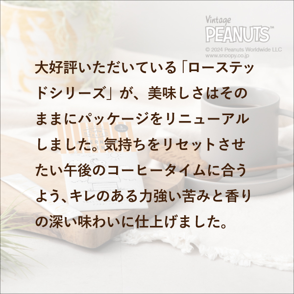 大好評いただいている「ローステッドシリーズ」が、美味しさはそのままにパッケージをリニューアルしました。気持ちをリセットさせたい午後のコーヒータイムに合うよう、キレのある力強い苦みと香りの深い味わいに仕上げました。
