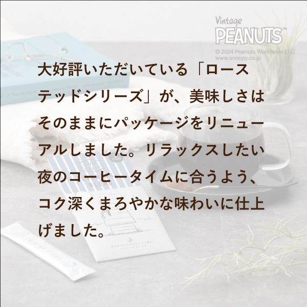 大好評いただいている「ローステッドシリーズ」が、美味しさはそのままにパッケージをリニューアルしました。リラックスしたい夜のコーヒータイムに合うよう、コク深くまろやかな味わいに仕上げました。