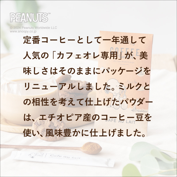 定番コーヒーとして一年通して人気の「カフェオレ専用」が、美味しさはそのままにパッケージをリニューアルしました。スヌーピーの大好物であるチョコチップクッキーとマッチするオリジナルのカフェオレ・ブレンド。コーヒー豆はエチオピア産を使用。