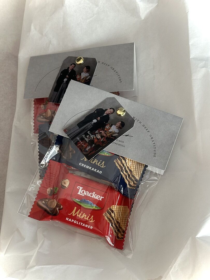 2月の挙式のため、バレンタインをイメージしチョコレートのプチギフトとして購入しました。 無料特典のシールのクオリティがとても良かったです。 好きなキャラクターのぬいぐるみの写真をシールにできて、 オリジナルのプチギフトになりました。