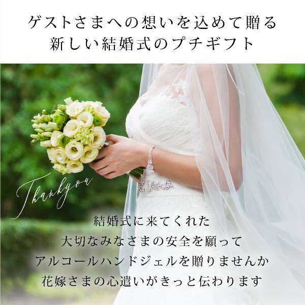 結婚式に来てくれた大切なみなさまの安全を願ってアルコールハンドジェルを贈りませんか?花嫁さまの心遣いがきっと伝わります。