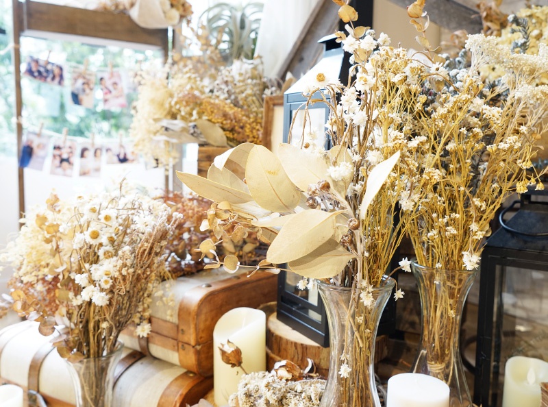 「ラスティック×ブルーム」のテーマで飾られた店内は、ドライフラワーが吊り下げられて色鮮やかな空間に。