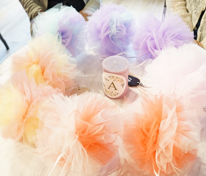 ワークショップはチュールポンポン作り♡DIY初心者でも簡単に作ることができて、装飾やフォトタイムでも使える万能アイテムです。皆さまチュールを選ぶところから夢中で、色とりどりのチュールポンポンが完成!グラデーションで作るとさらに可愛いさ倍増!