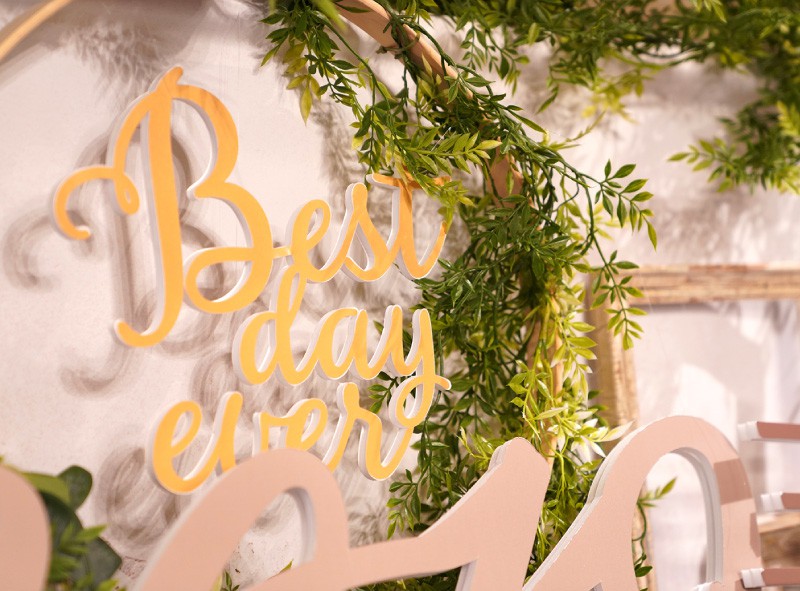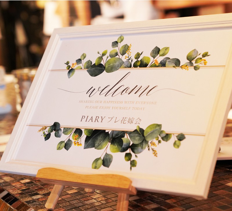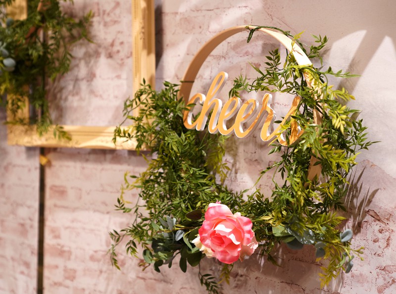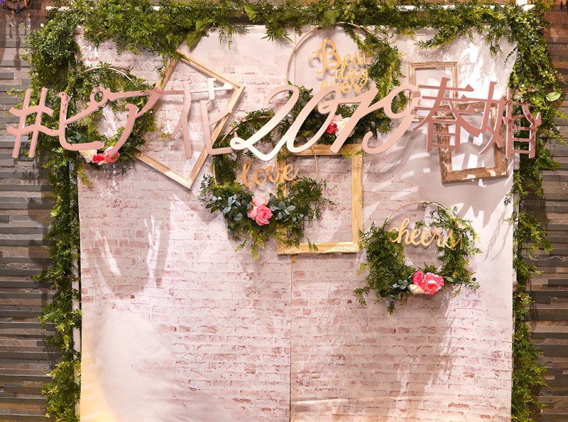 今回は草花を使ったリース、フレームを取り入れた海外風の装飾で皆さまをお出迎え♡背景のレンガ柄がよりナチュラルな空間を演出してくれます♪プレ花嫁さまからは「この装飾すごくおしゃれですね!」と嬉しいお言葉も。