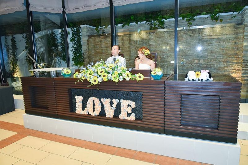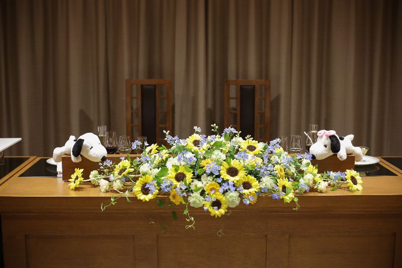 結婚式のテーマは誕生花の“ひまわり”と大好きな“スヌーピー”<br>誕生花のひまわりで、ブーケを手作り。さらにウェルカムスペースやゲストテーブル、高砂、ガーデンなどいたるところに装飾しひまわりの元気カラーで会場を明るく。そして大好きなスヌーピーをプラスしてウェルカムスペースなどに優しい雰囲気を。