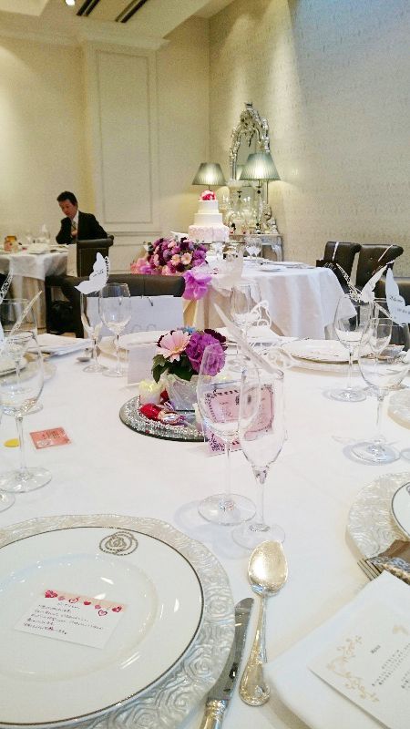 会場は、ハートとリボンでいっぱいに、それ以外は引き出物も含め食べ物重視にしました。<br>そのため、ゲストにはお料理やデザートブッフェで満足していただけたようです。<br>テーマカラーはピンクとパープルです。<br>大人可愛い感じになりました。