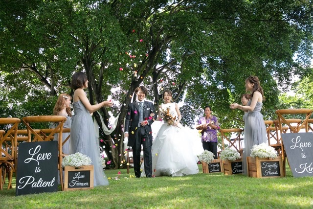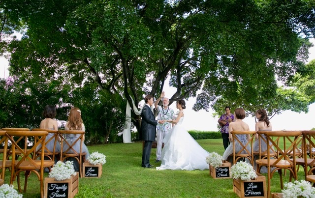 ハワイ『プルメリアガーデン』にて木漏れ日が降り注ぐバニヤンツリーの木の下で海と自然に囲まれながらの挙式♪