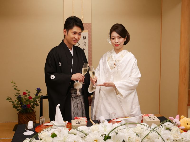 和装:厳かな伝統がある/2つの家族が交流できる会<br>洋装:ゲストが楽しめる/斬新と思ってもらえるような楽しみのある会<br>をコンセプトに企画しました。<br><br>和装は白無垢で、親族との会食・神前式を行い<br>洋装はウェディングドレスで、チームラボ協賛のプロジェクションマッピングの中での人前式。<br>マッピングは人感センサーが付いているので、投影された壁を触るとアクションが起き見て楽しめる演出でゲストからも好評でした!<br>また、披露宴は新郎新婦入場前からドリンク、食事をスタートしました。<br>待たせたくないという私たち二人の意向が好評でした。<br>入場時は、キャンドル型LEDライトで照明演出を行いました。こちらは初めて体験するゲストも多く、またとてもこだわってコマンド作成を行ったので達成感がありました。<br><br>参列者に子供が15名いたので、キッズスペースを作り大量のおもちゃを調達。<br>お持ち帰りしてもらい、喜んでもらえました。