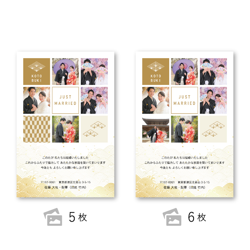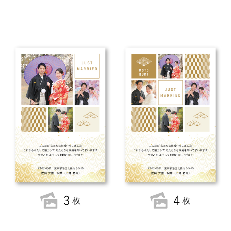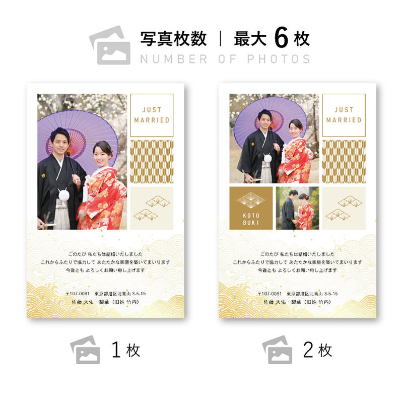 結婚報告を兼ねた年賀状状で、購入させて頂きました。 ただの印刷ではなく、金色の光沢がとてもきれいで、高級感があります!落ち着いた和のデザインで、目上の方にも送りやすいなと思いました。自分でアレンジもできるので、オリジナルの年賀状ができ満足です!