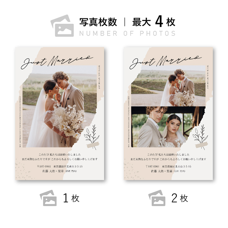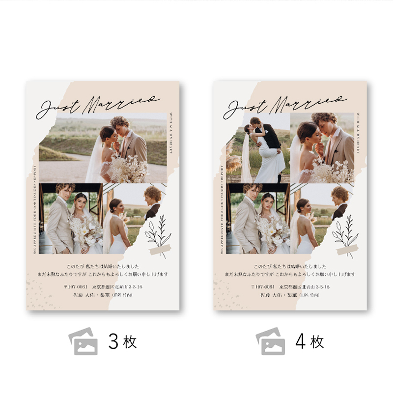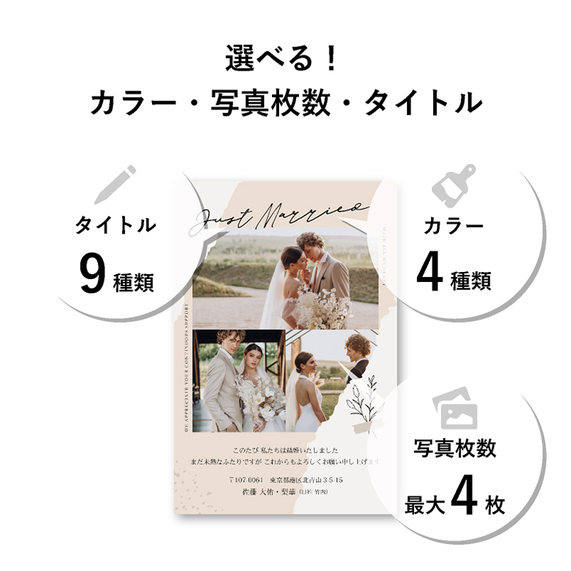 タイトルや写真の枚数など自由に組み合わせれるところが良かったです。そのため、凝りに凝ってしまいました...。オリジナルの結婚報告はがきが作れてよかったです。