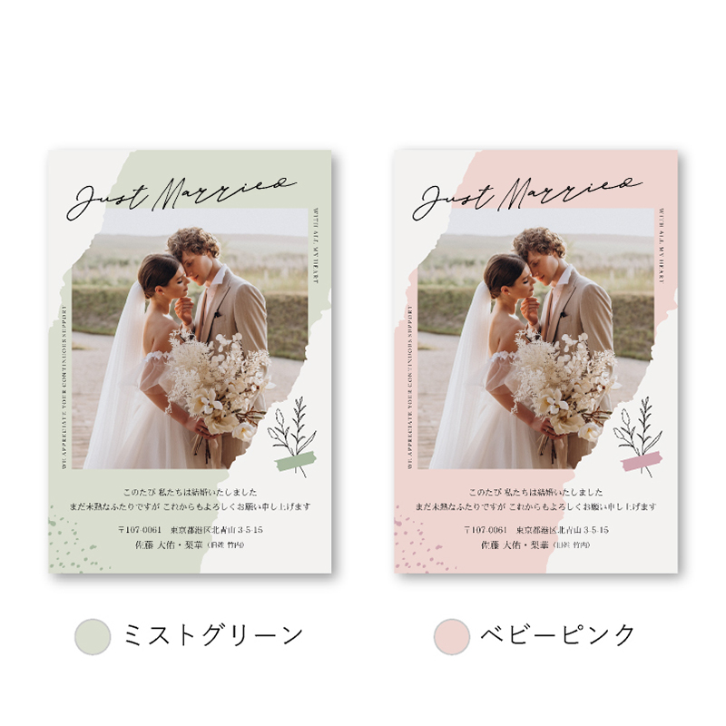 トレンドっぽい淡色が可愛すぎた!友人宛てにオシャレな結婚報告はがきを作りたかったのでこちらに決めましたが、飾っておきたくなるくらい好みで可愛いです◎