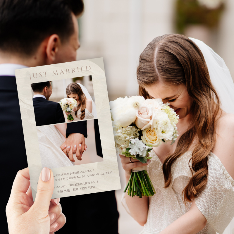 フォトフレームを連想するシンプルなデザインから覗くのは、おふたりの記念フォト。優しさと柔らかさを感じる落ち着いたくすみカラーと、人気のテクスチャーアートを装ったおしゃれなデザイン。ラスティックな印象が好きな方におすすめな1枚。