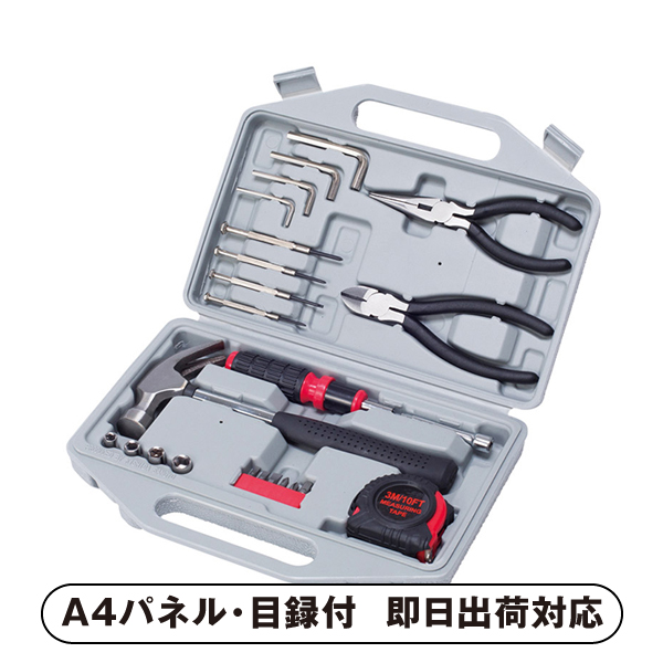 | 内容 | ケース(約290×205×55mm)・ビットドライバー・エクステンションバー・ビットアダプター・ハンマー・ラジオペンチ・メジャー・ニッパー×各1、精密ドライバー・六角レンチ・ソケット×各4、ビット×5 A4パネル×1 |