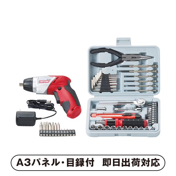 | 内容 | ケース(約195×135×45mm)・ラジオペンチ・ラチェットハンドル・ソケットアダプター・エクステンションバー・カッターナイフ・ビットドライバー・充電式電動ドライバー・電動ドライバー用ACアダプタ×各1、六角レンチ×8、精密ドライバー×6、ビット×10、ソケット×11、電動ドライバー用ビット×12 A3パネル×1 |
