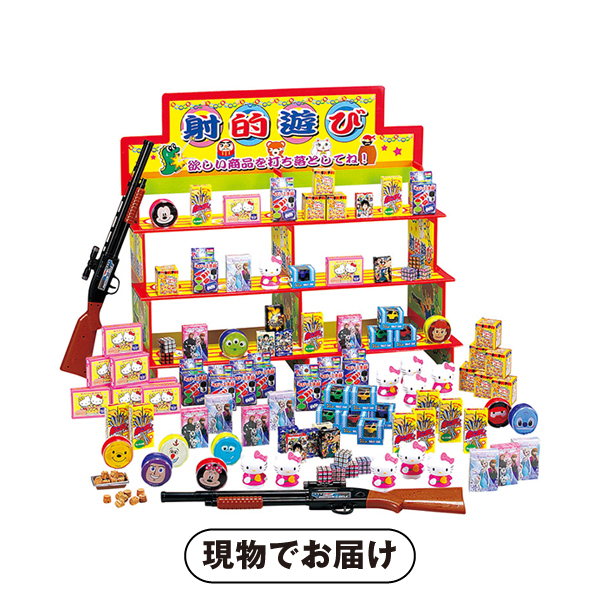 | 内容 | おもちゃアソート×100、鉄砲×2、コルク玉×40、コルク玉受皿×5、射的ディスプレイ台×1 |