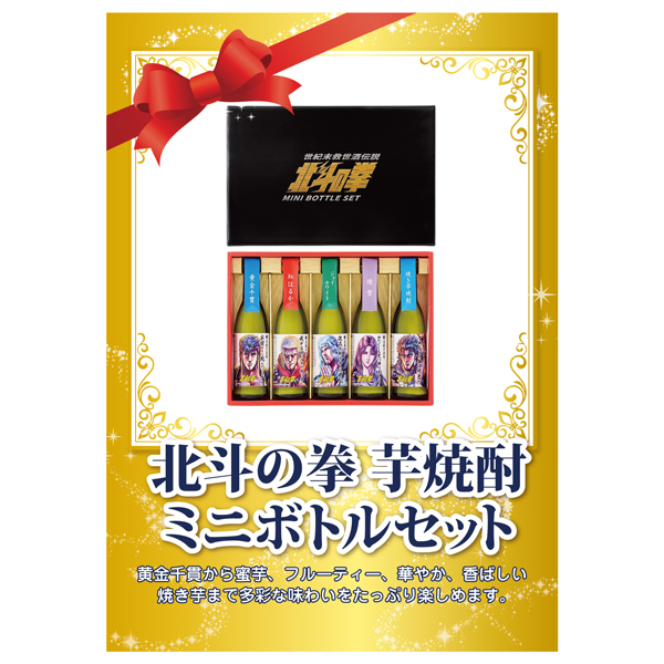 北斗の拳のキャラをイメージした芋焼酎5種セット。王道の黄金千貫から、甘み豊かな蜜芋、爽やかなフルーティー、華やかな香り、香ばしい焼き芋まで、多彩な味わいを楽しみ、自分好みの一杯を見つけましょう。