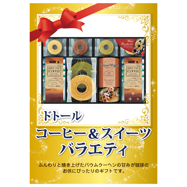 | 内容 | ミルクバウムクーヘン・宇治抹茶バウムクーヘン・ミニバウムクーヘン(ベルギーショコラ・宇治抹茶)・ベルギーワッフル(ショコラ)×各1、ドトールドリップコーヒー(深煎りブレンド7g・キリマンジャロブレンド7g)×各4、ミニバウムクーヘン(北海道生クリーム)・ベルギーワッフル(プレーン)×各2 A4パネル×1 |
