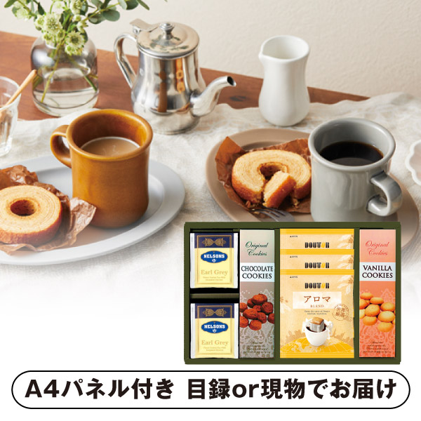 | 内容 | ドトールドリップコーヒーアロマブレンド7g×3、アールグレイ紅茶ティーバッグ(NELSONS)2g×12、チョコクッキー30g・バニラクッキー30g×各1 A4パネル×1 |