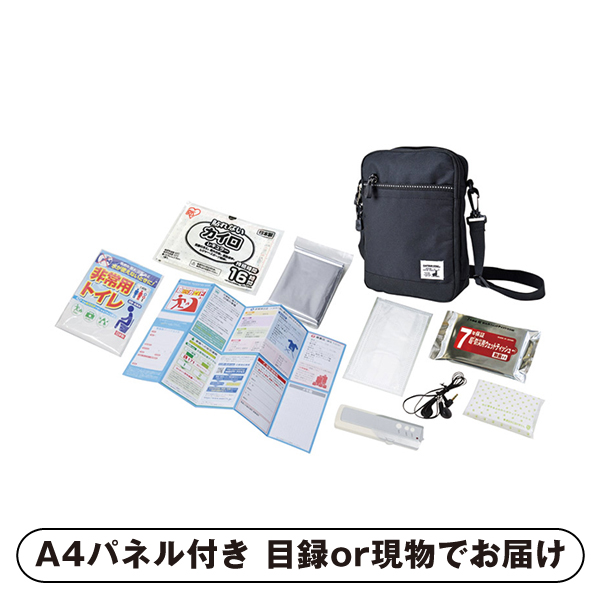 | 内容 | ショルダーバッグ(約170×240×70mm)×1、防寒シート・非常用トイレ・ポケットティッシュ(8W)・カイロ・マスク・防災用ウエットティッシュ(20枚)・コンパクトFMラジオ・防災ガイド×各1 A4パネル×1 |