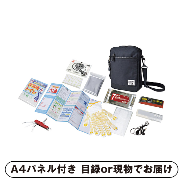 | 内容 | ショルダーバッグ(約170×240×70mm)×1、防寒シート・非常用トイレ・ポケットティッシュ(8W)・カイロ・マスク・防災用ウエットティッシュ(20枚)・コンパクトFMラジオ・万能ナイフ・すべり止め手袋・レインポンチョ・防災ガイド×各1 A4パネル×1 |