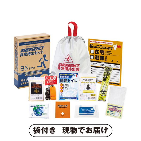 | 内容 | 非常持出袋(約340×300mm)×1、防災の心得・ホイッスル・レインコート・抗菌消臭トイレ・発光スティック・アルミブランケット・除菌アルコールウェットティッシュ・マスク・緊急避難カード・水に流せるペーパー×各1 |