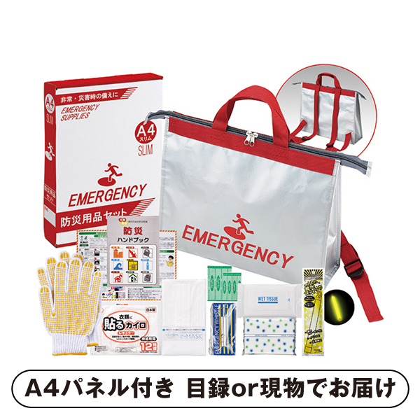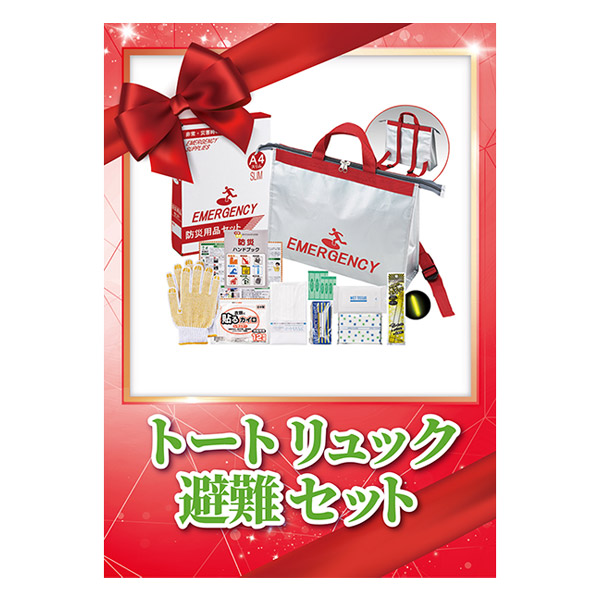 | 内容 | トートリュックバッグ(約100×370×295mm)×1、発光スティックライト・ウェットティッシュ(10枚)・ポケットティッシュ・防災ハンドブック・軍手・エイトバン(大小×各2)・使い捨てカイロ・マスク・ホイッスル×各1 A4パネル×1 |