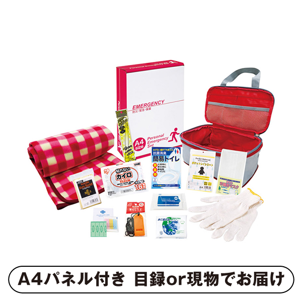 | 内容 | 圧縮収納バッグ(約180×270×125mm)×1、ホイッスル・カイロ・レインコート・抗菌消臭簡易トイレ・発光スティック・軍手・アルミブランケット・綿棒&絆創膏・マスク・除菌アルコールウェットティッシュ・水に流せるペーパー・フリースブランケット×各1 A4パネル×1 |