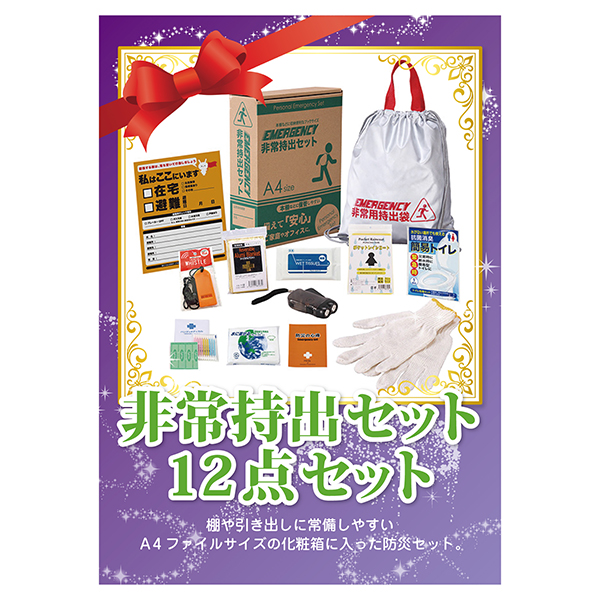 棚や引き出しに常備しやすいA4ファイルサイズの化粧箱に入った防災セット。