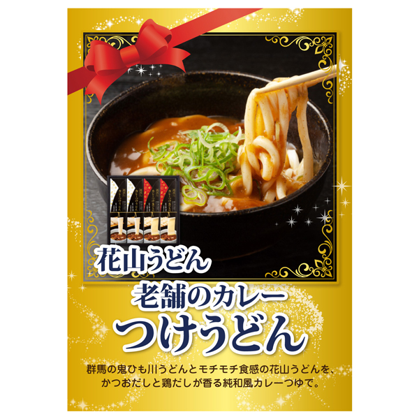 | 内容 | カレーつけうどん(うどん:90g・カレーつゆ:180g)・カレーつけ鬼ひも川(鬼ひも川:90g・カレーつゆ:180g)×各2 A4パネル×1 |