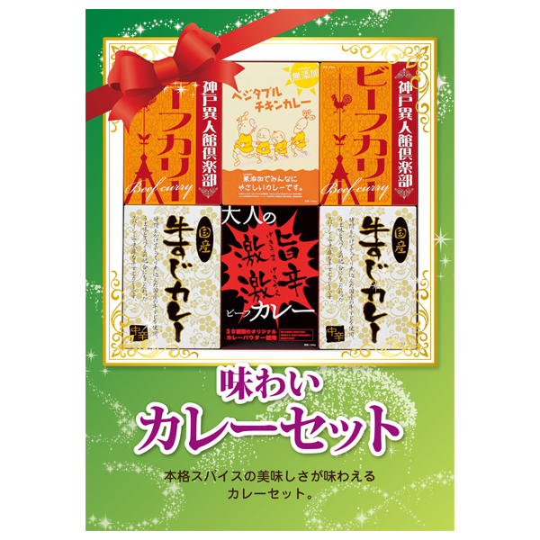 | 内容 | 牛すじカレー(180g)・神戸異人館倶楽部ビーフカリー(180g)×各2、大人の激旨激辛カレー(180g)・ベジタブルチキンカレー(100g)×各1 A4パネル×1 |